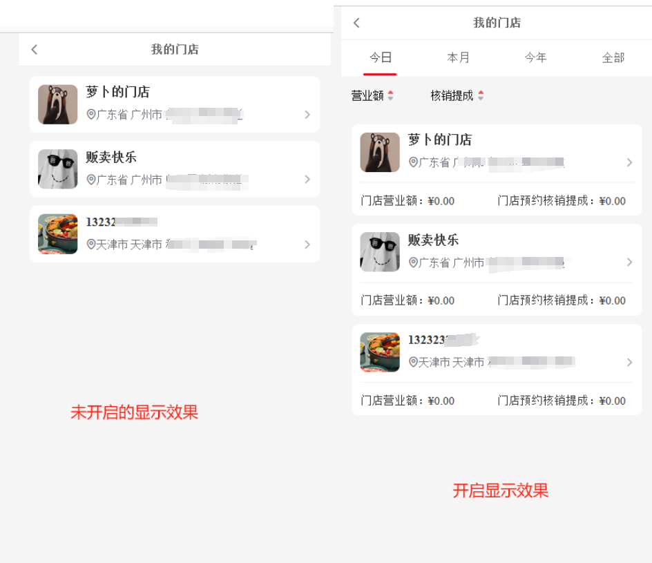 5.招商员门店收入显示:开启后前端招商员门店显示门店收入、门店提成以及时间、排序筛选按钮