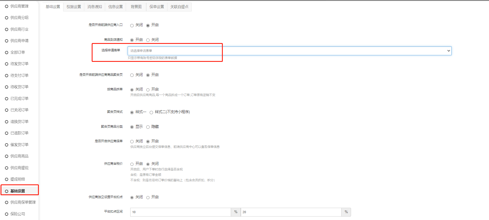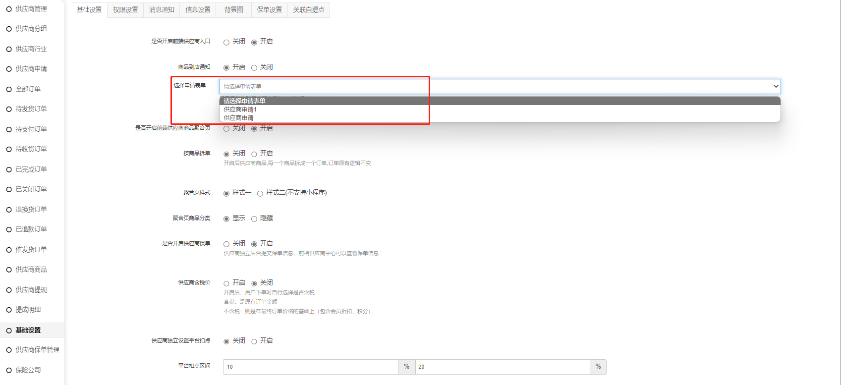 搭配供应商管理插件使用,会员申请供应商的表单除了系统默认外,还可选自定义表单。路径:后台供应商管理 -- 基础设置 -- 选择申请表单
