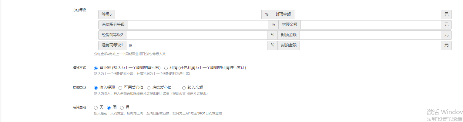 8、股东分红结算周期,支持按天/周/月三种周期选择;按天是前一天的营业额计算,按周为上周一至周日的营业额计算,按月为上月1号至30/31日的营业额计算。